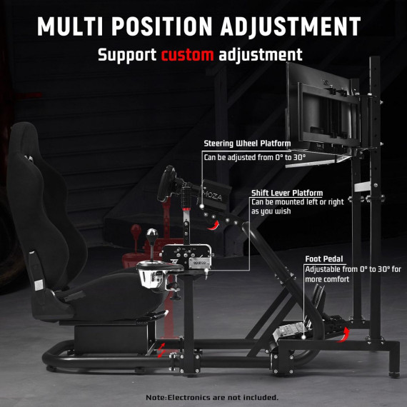 Dardoo complete cockpit enhances user comfort with a multi-position ergonomic seat featuring dual sliding rails and high-resilience padding, accommodating individuals from 1.5m to 1.9m tall. As a complete structural solution, the Dardoo cockpit requires separate purchase of electronic peripherals, providing a robust and customizable foundation for serious sim racing enthusiasts.