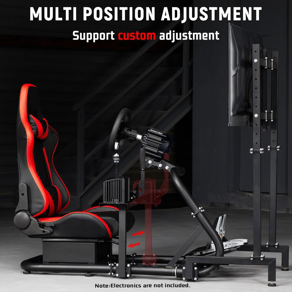 Dardoo racing simulatior cockpit, red leather seats, adjustable design, seat backrest can be adjusted 90 ° -180 °. The monitor bracket supports installation sizes ranging from 75 * 75 to 400 * 400, and can accommodate multiple specifications of monitor installation sizes.