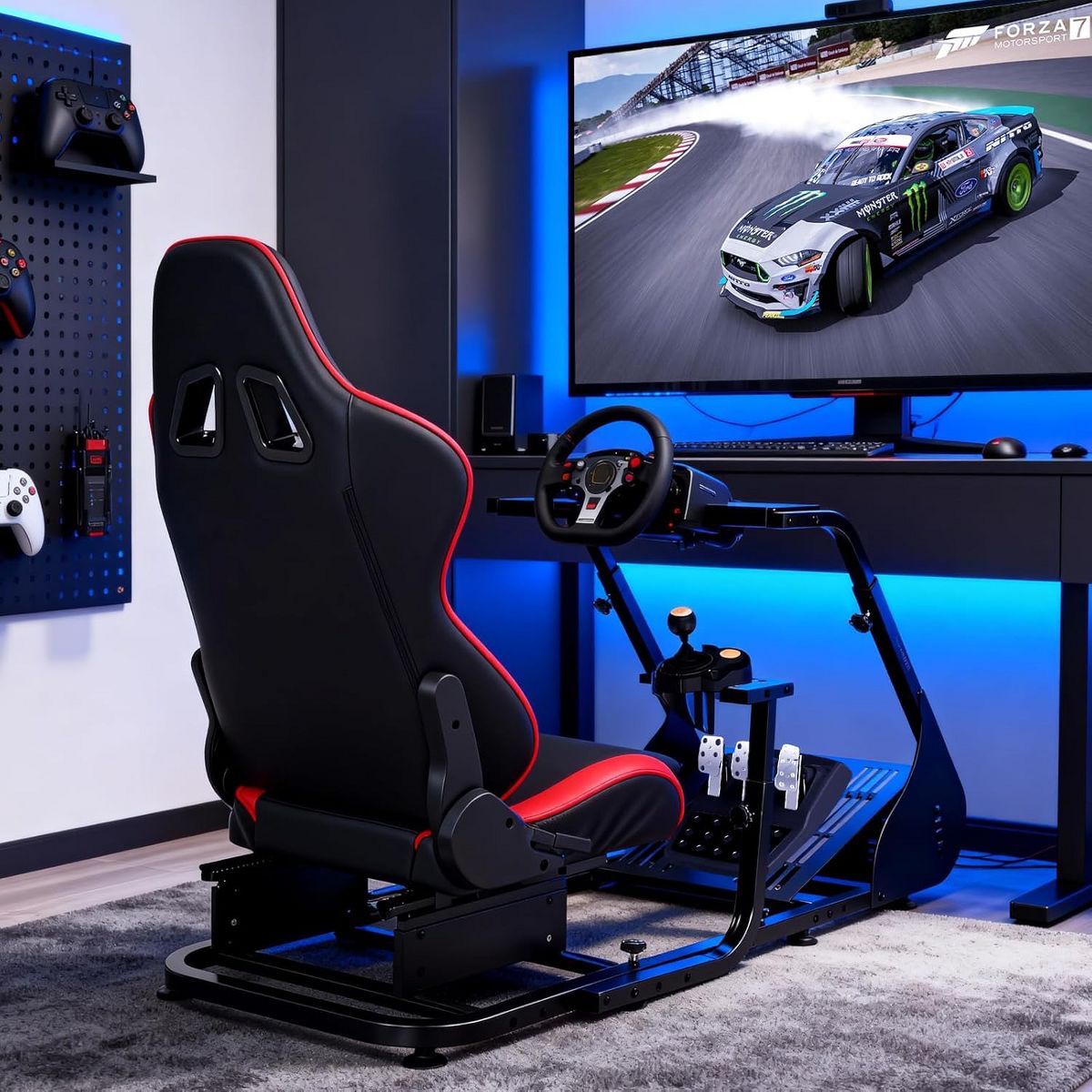 This racing stand provides a firm base for immersive play. Its reinforced steel frame remains secure during use. It fits a range of popular racing peripherals via adaptable mounting points. The design focuses on personal comfort, featuring an adjustable wheel mount, a multi-use shifter holder, and variable pedal positioning. The unit is upholstered for comfort during long sessions and folds away neatly, making it a practical choice for spaces of any size. Professional installation is recommended for optimal assembly.
