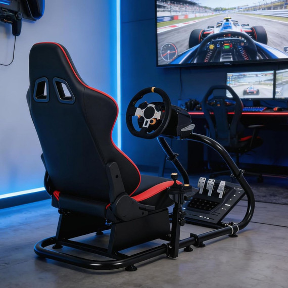 This racing stand provides a firm base for immersive play. Its reinforced steel frame remains secure during use. It fits a range of popular racing peripherals via adaptable mounting points. The design focuses on personal comfort, featuring an adjustable wheel mount, a multi-use shifter holder, and variable pedal positioning. The unit is upholstered for comfort during long sessions and folds away neatly, making it a practical choice for spaces of any size. Professional installation is recommended for optimal assembly.