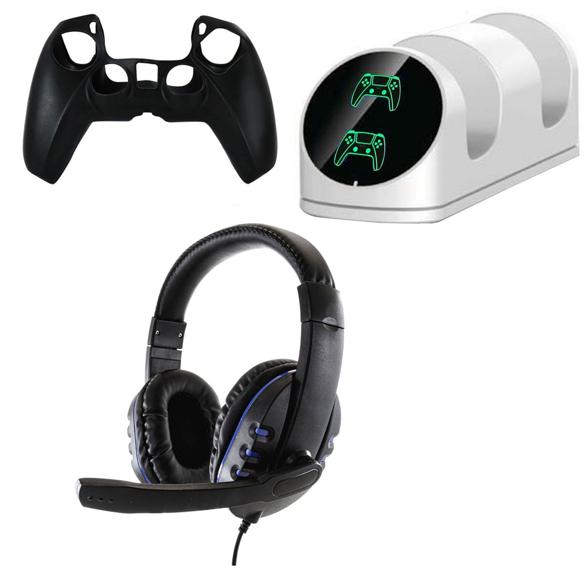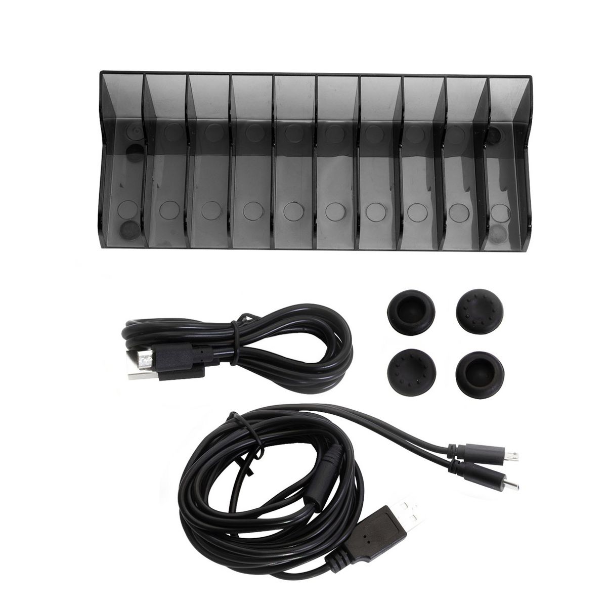 10 in 1 Accessories Pack is designed to protect and use the game controllers or console perfectly. There is a:Dual Charging Dock, Micro USB Cable, Silicone Case, 2in1 Micro USB Cable, 4 Thumb Grips, Storage Stand and Wired Headset.