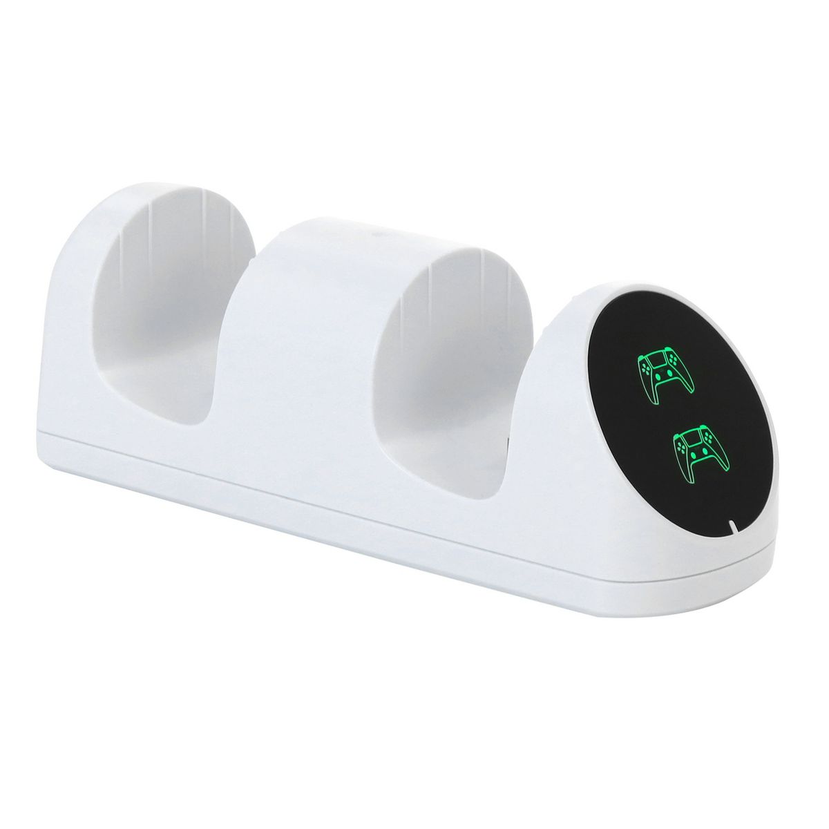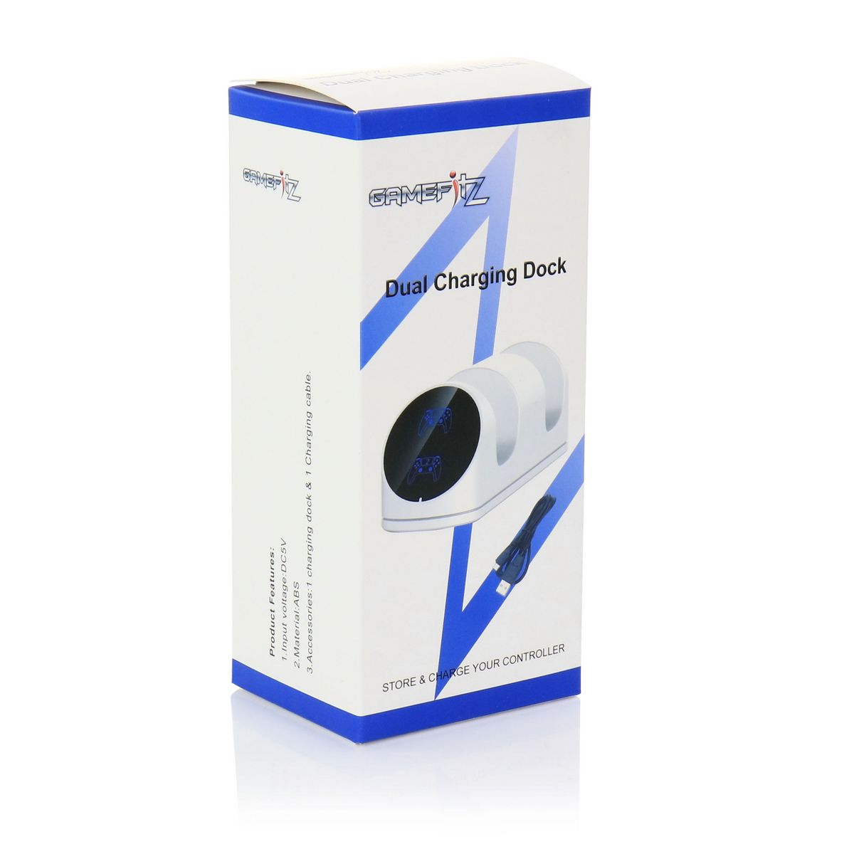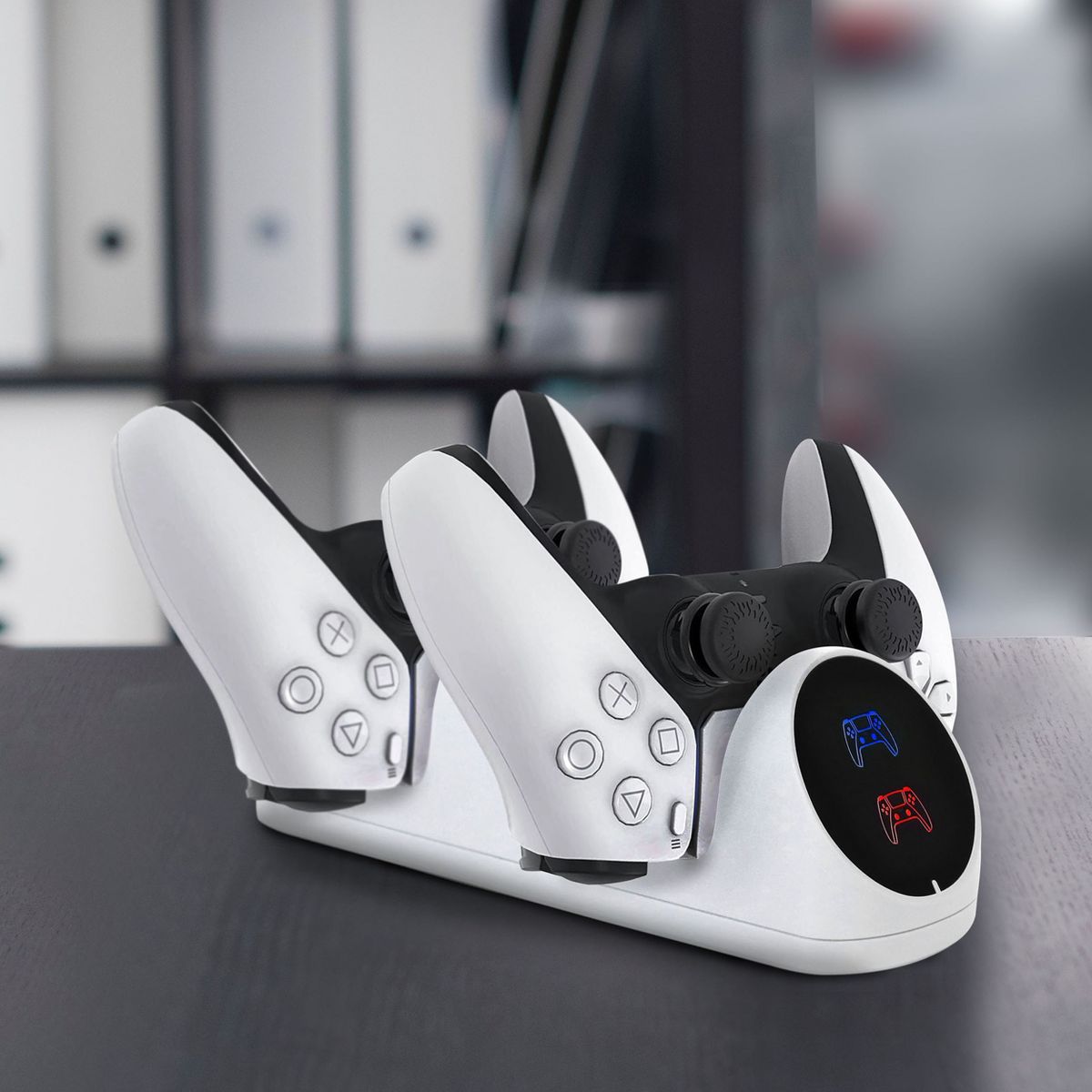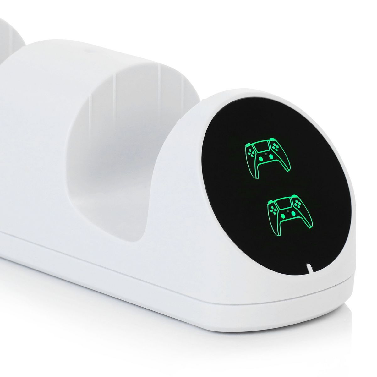 The GameFitz PlayStation 5 Dual Charging Dock allows you to charge two controllers at once. This dock comes with a USB charging cable for convenient charging and the front screen lights up when controllers are docked and charging. Compact size is perfect for small spaces and allows you to both store and charge your controllers simultaneously.