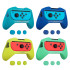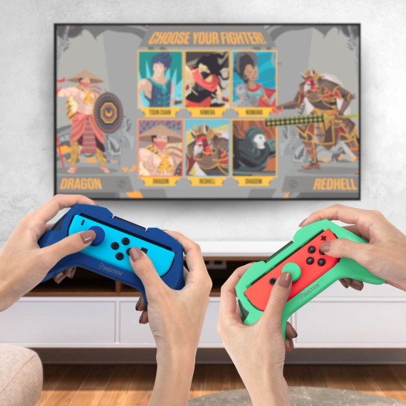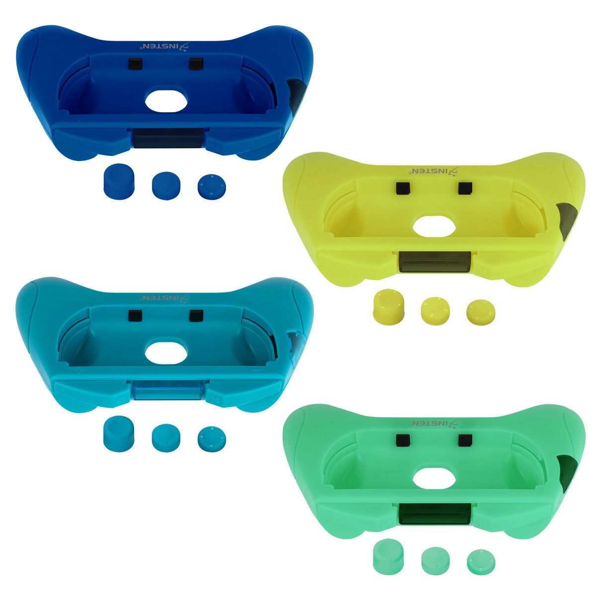 Expand your video game accessories collection with these controller grips, designed to be compatible with the Nintendo Switch Joy-Con controllers. Each controller grip can snugly and securely hold either the left or right Joy-Con controller in a familiar form more suited to people with larger hands, helping prevent unnatural angles and the hand and finger cramping that can result during long gameplay sessions. The shoulder triggers extend to activate the triggers on the Joy-Con, while the included controller thumb grips make it easier to grip and control the joystick. Each controller grip has a comfortable, slip-resistant matte finish that makes it easier to grip than controllers with smooth finishes. These controller grips come in Blue, Dark Blue, Turquoise, and Neon Yellow colors designed to match those of the stock Joy-Con controllers. This product is intended for use by persons 13 years of age and older.