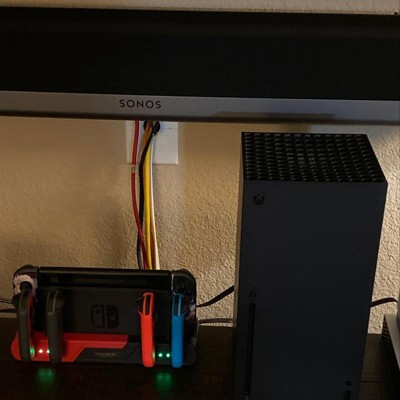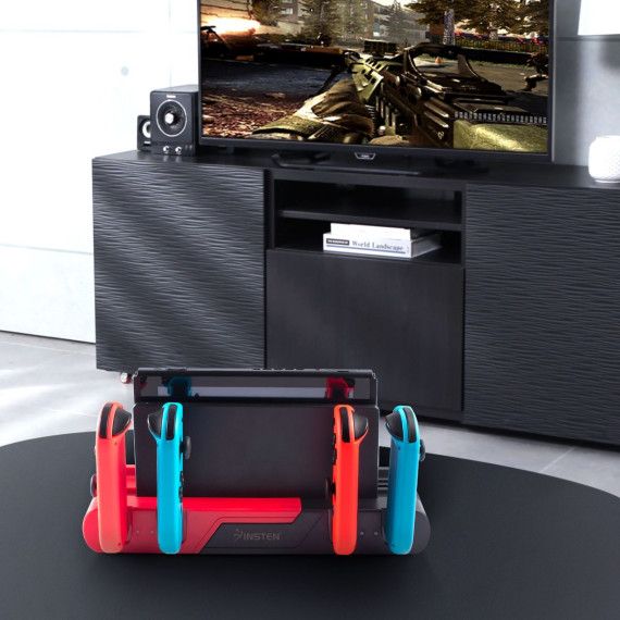 Compatible with Nintendo Switch (2017) and Switch OLED Model (2021). Charge up to 6 Joy-Con controllers simultaneously with this docking station, allowing 4 Joy-Cons on the dock and 2 on the console. Designed to connect with the original console dock for power, it offers an intelligent solution for expanded charging needs. Easy to set up with the precise slide-in design, simply attach it via USB to the console dock for a plug-and-play experience. Stay informed about charging status with the smart LED indicator that emits a red glow while charging and turns green when fully charged. This charger goes beyond charging by providing built-in game card storage slots for convenient access to your favorite games. It also includes an extra USB port for expanded connectivity with additional devices or gaming accessories. The package includes a charging dock station compatible with Nintendo Switch (2017) and Switch OLED Model (2021), featuring game storage and simultaneous charging for up to 6 controllers. Keep your controllers organized and showcase your console and controllers on your gaming desk. It's the perfect gift for Switch gamers who value convenience and organization in their gaming setup.