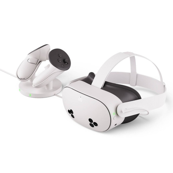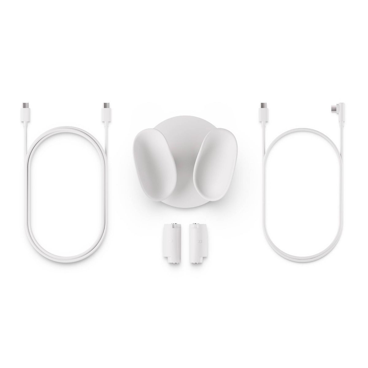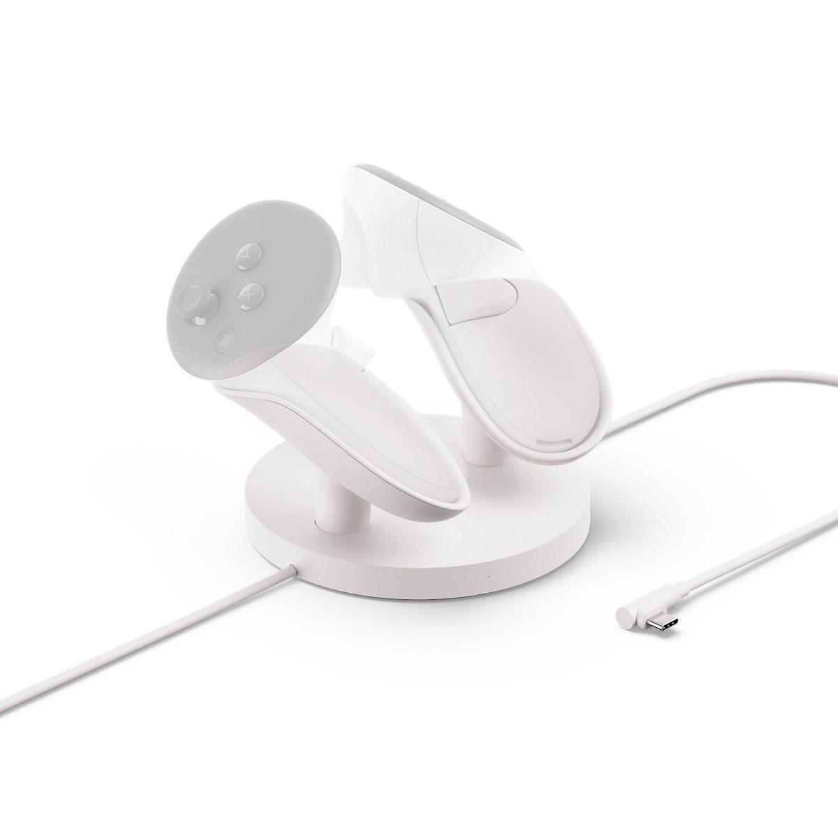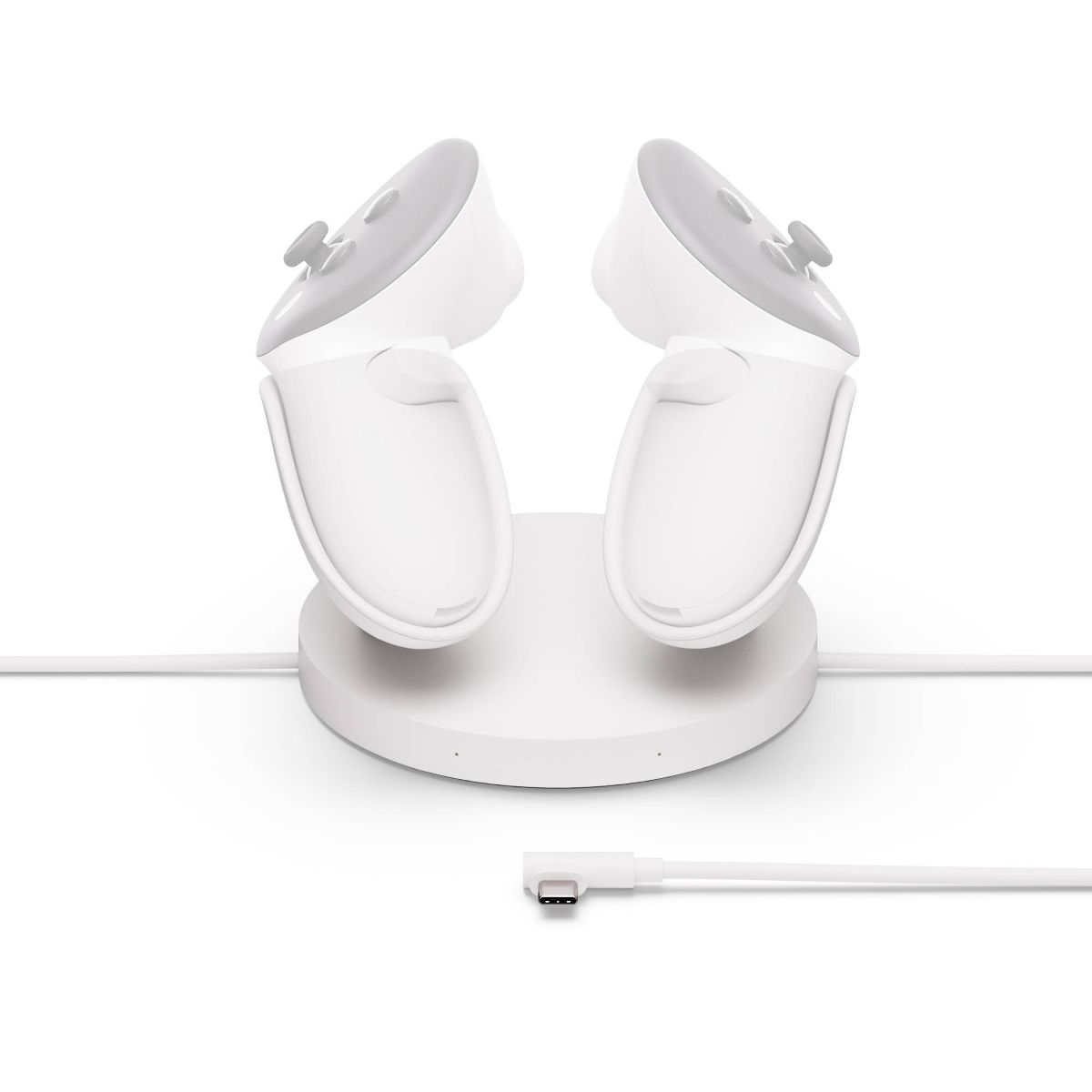 Stay powered and ready to play in mixed reality and VR with this compact charger, featuring drop-in wireless controller charging. Keep your Meta Quest 3/3S headset and Touch Plus Controllers organized while they charge back up. Includes an extended headset charging cable and rechargeable lithium-ion batteries for your controllers. This charging dock works while using Active Straps without the need to remove them (sold separately).