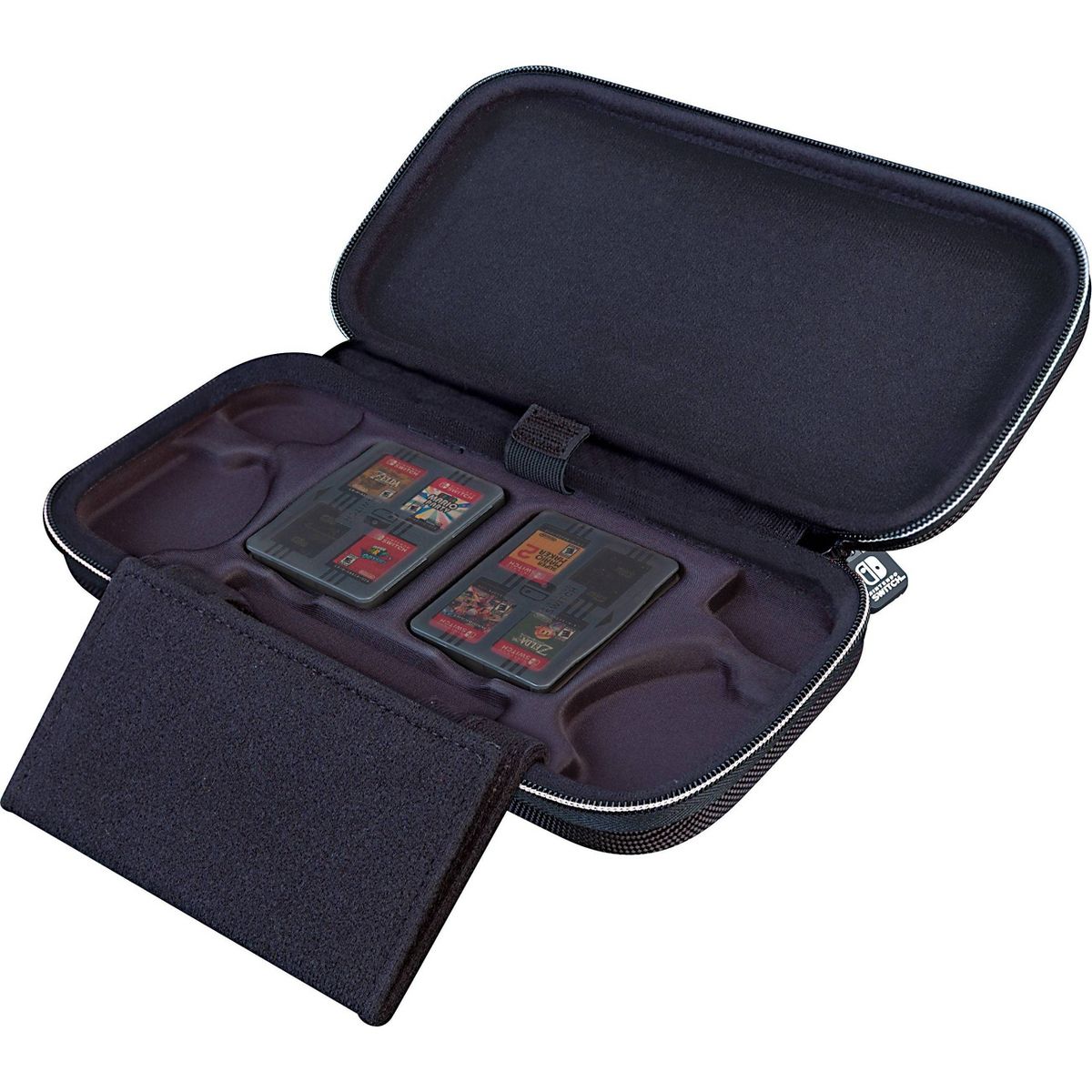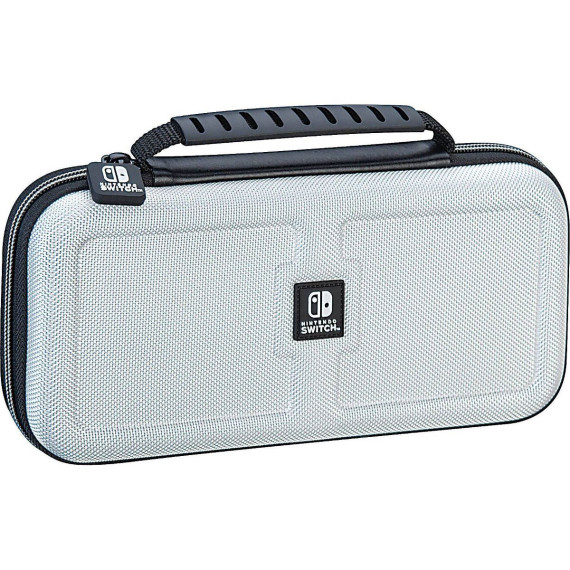 Nintendo Switch Game Traveler Deluxe Travel Case is Designed for All Nintendo Switch Systems. The Deluxe Travel Case has a hardshell case to protect Nintendo Switch, Nintendo Switch Lite, or Nintendo Switch OLED Model System. It features a viewing stand to easily adjust to your desired viewing angle. Comfortable carrying handle. The case includes two game card cases. Each case holds 4 Nintendo Switch Game Cards and stores neatly beneath the Nintendo Switch system. This case also includes two Micro SD card cases. Each case holds 2 Micro SD cards. Official Nintendo Licensed Product. RDS NNS40W