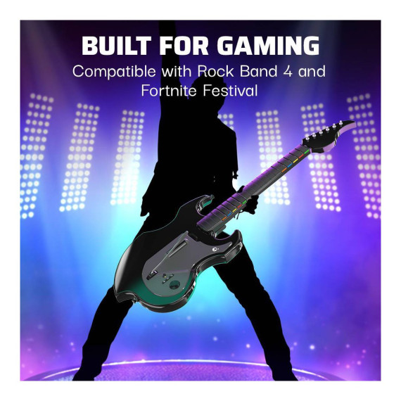 Rock On with the RIFFMASTER wireless guitar controller! The newest guitar in the market allows you to play music like a true rock star now on Fortnite Festival and Rock Band 4. With a unique design that is suitable for both left and right handed guitarists, everybody has a chance to dominate the competition.