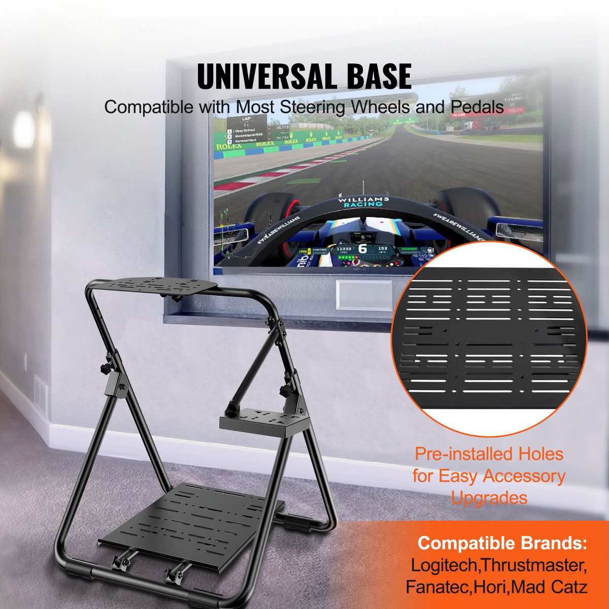 Mainstream Fit: Pre-installed holes for steering wheels, pedals and speed boards from several major brands. You can replace or upgrade your accessories at any time without worrying about compatibility issues.