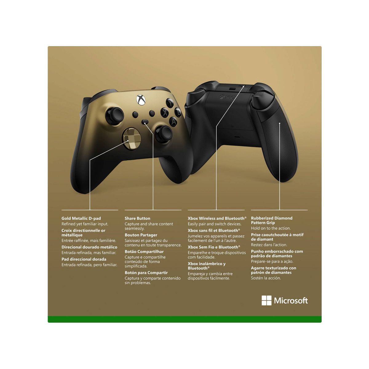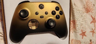 Shine from the shadows with the Xbox Wireless Controller – Gold Shadow Special Edition, featuring a brilliant gold-to-black metallic finish. Play on console, PC, and mobile. Stay on target with an elegant gold, metallic hybrid D-pad. Hold on to all the action with rubberized, black diamond-pattern side grips and textured grip on the triggers, bumpers, and back-case. Seamlessly capture and share content such as screenshots, recordings, and more with the Share button. Connect using the USB-C port for direct plug and play to console and PC. Support for AA batteries is included on the rear. Get up to 40 hours of battery life. Plug in any compatible headset with the 3.5mm audio jack. Use the Xbox Accessories app to remap buttons and create custom controller profiles for your favorite games. Quickly pair with, play on, and switch between devices including console, PC, and mobile.*
