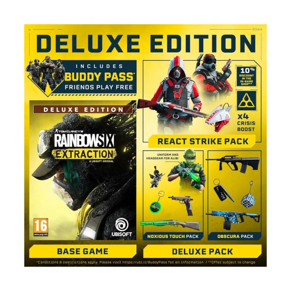 Gear Up for the Ultimate Siege with Tom Clancy's Rainbow Six: Extraction - Deluxe Edition.Step into the thrilling world of tactical warfare with Tom Clancy's Rainbow Six: Extraction (Deluxe Edition). This action-packed game takes you on an intense journey where strategy, teamwork, and precision are key to combating a lethal alien threat. The Deluxe Edition includes exclusive in-game content and enhancements, making it the definitive version for fans and newcomers alike.Lead your elite team against an alien menace in this immersive tactical shooter.Features:Deluxe Edition with exclusive bonus content and game enhancementsIntense cooperative gameplay for up to three playersDeep customization options for operators and gearHigh-stakes missions with evolving challengesStunning graphics and immersive environmentsSuitable for ages 18 and up
