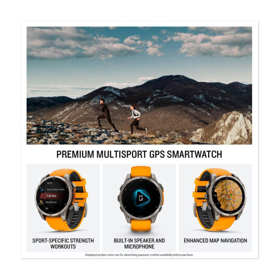 Be limitless. The fēnix® 8 multisport GPS smartwatch is built for serious athletes and outdoor adventurers who want to push beyond their limits. It features a bright 1.4” AMOLED display, stainless steel bezel and powerful built-in LED flashlight for after-dark visibility. A built-in speaker and mic enable you to make and take calls from your wrist when your watch is paired to your smartphone. Power up your body’s performance, endurance and resistance to injury with the latest in targeted strength training plans plus a full range of sport-specific workouts. Performance insights help manage your exertion and build stamina, while training readiness features show how much recovery time you need between workouts, based on 24/7 health and wellness monitoring of heart rate, respiration, stress, sleep and more (data presented is intended to be a close estimation of metrics tracked). Take to the trails with built-in ABC sensors and TopoActive maps that can be easily downloaded via Wi-Fi® connectivity. The dynamic round-trip routing feature helps simplify the planning of your runs or rides — letting you set your target distance and receive turn-by-turn directions that adjust to get you back to your start on schedule. Enjoy extended off-grid adventures with up to 16 days of battery life in smartwatch mode. Plus, a 40-meter dive rating and leakproof metal buttons let you reach new depths of adventure. Additional features include music storage, Garmin Pay™ contactless payments (with a supported country and payment network), smart notifications (compatible smartphone required) and more.