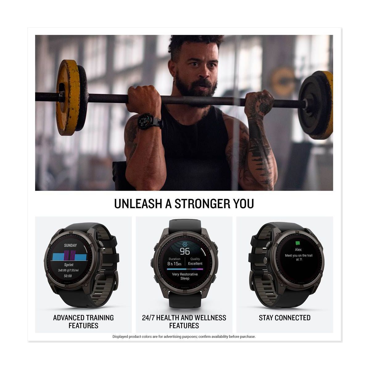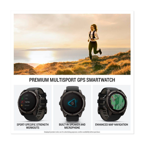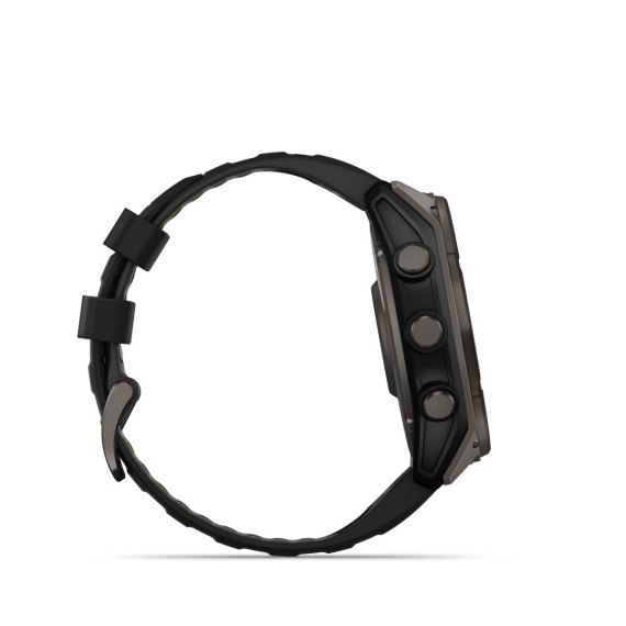 Be limitless. The fēnix® 8 multisport GPS smartwatch is built for serious athletes and outdoor adventurers who want to push beyond their limits. It features a 1.4” solar charged display with scratch-resistant sapphire lens, durable titanium bezel and powerful built-in LED flashlight for after-dark visibility. A built-in speaker and mic enable you to make and take calls from your wrist when your watch is paired to your smartphone. Power up your body’s performance, endurance and resistance to injury with targeted strength training plans and a full range of sport-specific workouts. Performance insights help manage your exertion and build stamina, while training readiness features show how much recovery time you need between workouts, based on 24/7 health and wellness monitoring of heart rate, respiration, stress, sleep and more (data presented is intended to be a close estimation of metrics tracked). Take to the trails with built-in ABC sensors and preloaded TopoActive maps. The dynamic round-trip routing feature helps simplify the planning of your runs or rides — letting you set your target distance and receive turn-by-turn directions that adjust to get you back to your start on schedule. Enjoy extended off-grid adventures with solar power providing up to 149 hours of battery life in GPS mode (assumes continuous use for entire period in 50,000 lux conditions). Plus, a 40-meter dive rating and leakproof metal buttons let you reach new depths of adventure. Additional features include music storage, Garmin Pay™ contactless payments (with a supported country and payment network), smart notifications (compatible smartphone required) and more
