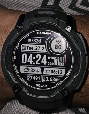Whatever you do, own it with Instinct® 2X Solar. This bold, rugged GPS smartwatch is tough enough to keep up with you and unique enough to fit your style. Plus, solar charging gives you unlimited battery life in smartwatch mode when exposed to 3 hours of direct sunlight (50,000 lux) per day. When the sun sets, use the built-in LED flashlight to keep going and stay visible. Do more of what you love with preloaded activity profiles for running, biking, swimming, strength training and more. Count on multi-band signal reception technology to provide more accurate positioning, and multi-GNSS support to provide more reliable service in challenging environments. Check your wrist to stay connected with smart notifications, Garmin Pay™ contactless payments and Connect IQ™ app integration (when paired with your compatible smartphone). Understand your body better with all-day health monitoring for energy levels, stress, sleep, Pulse Ox, heart rate and more (this is not a medical device, and data presented is intended to be a close estimation of metrics tracked. Pulse Ox not available in all countries).