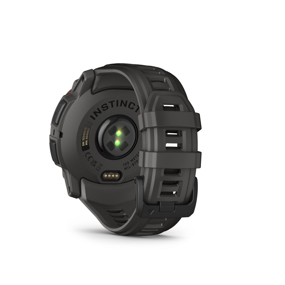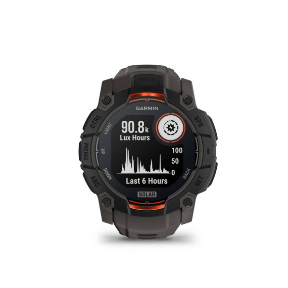 Instinct® 3 is the rugged 45 mm GPS smartwatch with a 0.9” display, built-in flashlight and unlimited battery life in smartwatch mode with solar charging (assumes all-day wear with 3 hours per day outside in 50,000 lux conditions). With bolted construction, a metal-reinforced bezel and scratch-resistant lens, it can take on your toughest adventures. It’s engineered to MIL-STD-810 standards for thermal and shock resistance and is also 10 ATM water-rated. To keep you on track, the Instinct 3 smartwatch includes a built-in 3-axis compass and barometric altimeter. Plus, multi-band GPS with SatIQ™ technology delivers superior positioning while also optimizing battery life. Its 24/7 health and wellness features keep you connected to your body with heart rate tracking, advanced sleep monitoring, Pulse Ox and more (this is not a medical device, and data presented is intended to be a close estimation of metrics tracked; Pulse Ox not available in all countries). Instinct 3 also includes Garmin Pay™ contactless payments (with a supported bank).