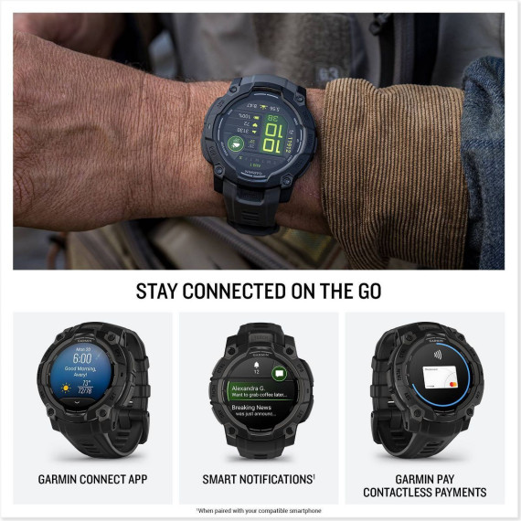 Instinct® 3 is the rugged 50 mm GPS smartwatch with a 1.3” AMOLED display, a built-in flashlight and up to 24 days of battery life in smartwatch mode. With bolted construction, a metal-reinforced bezel and scratch-resistant lens, it can take on your toughest adventures. It’s engineered to MIL-STD-810 standards for thermal and shock resistance and is also 10 ATM water-rated. To keep you on track, the Instinct 3 smartwatch includes a built-in 3-axis compass and barometric altimeter. Plus, multi-band GPS with SatIQ™ technology delivers superior positioning while also optimizing battery life. Its 24/7 health and wellness features keep you connected to your body with heart rate tracking, advanced sleep monitoring, Pulse Ox and more (this is not a medical device, and data presented is intended to be a close estimation of metrics tracked; Pulse Ox not available in all countries). Instinct 3 also includes Garmin Pay™ contactless payments (with a supported bank).
