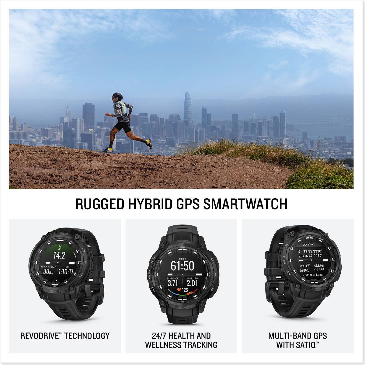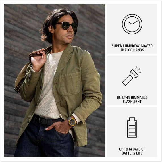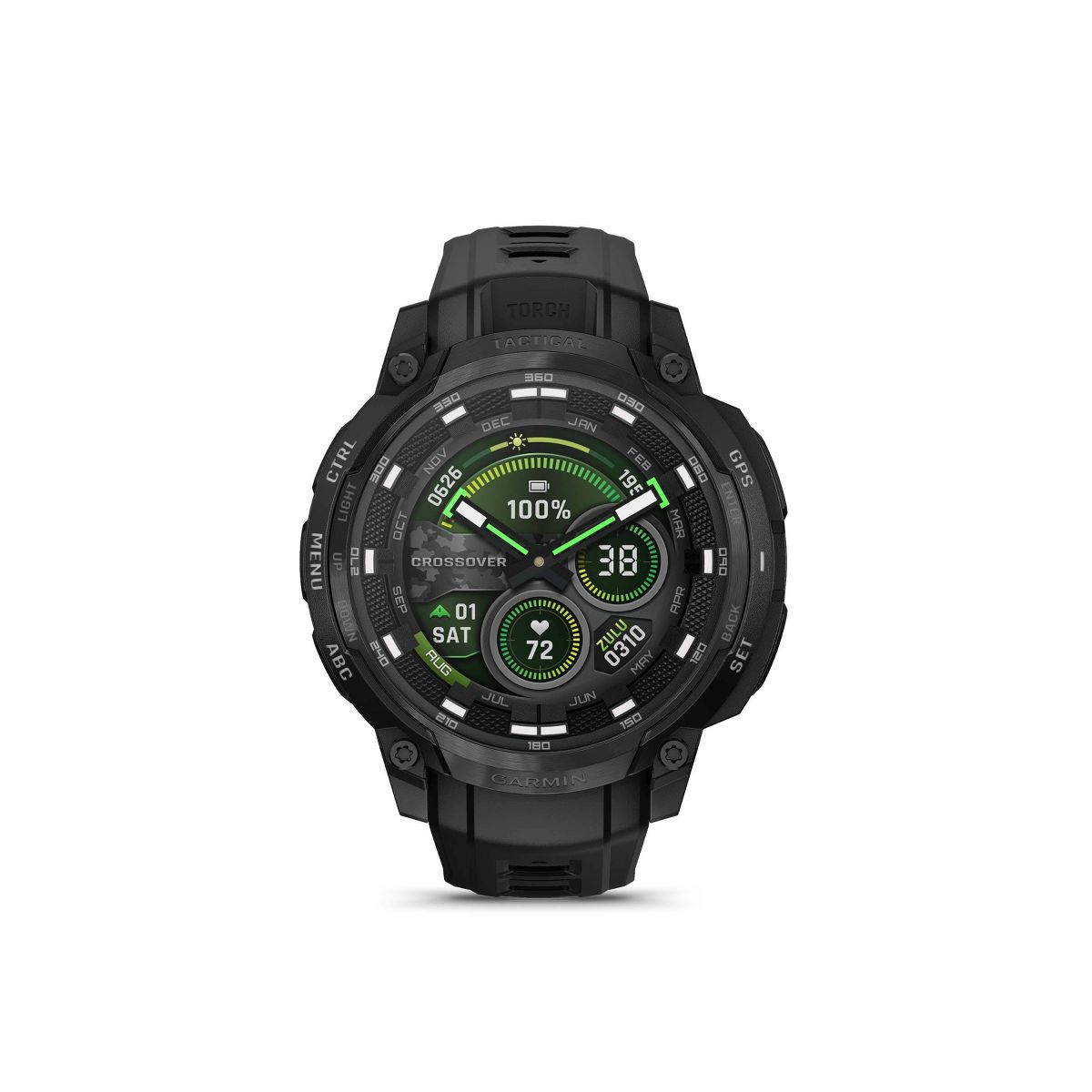 Instinct® Crossover AMOLED – Tactical Edition is the mission-ready hybrid GPS smartwatch with analog watch hands and a bright AMOLED display. The 1.2" digital display, protected by a sapphire lens, brings data to life with detail-rich graphics. A dimmable LED flashlight and rugged MIL-STD 810 build quality for thermal and shock resistance make it ready for your toughest adventure. Tactical features such as stealth mode, rucking activity, night vision goggle compatibility, dual-format GPS and preloaded Applied Ballistics® solver (requires one-time purchase via the AB Quantum mobile app) make this ideal for those needing an edge. Superior readability of the analog hands, even in low-light conditions, is further enhanced by the bright display. All-day health and wellness monitoring keeps an eye on your heart rate, sleep, stress and more (data presented is intended to be a close estimation of metrics tracked). Stay connected with smart notifications, Garmin Pay™ contactless payments and Connect IQ™ Store integration when paired with your smartphone. Enjoy up to 14 days of battery life in smartwatch mode and up to 18 days in battery saver mode.