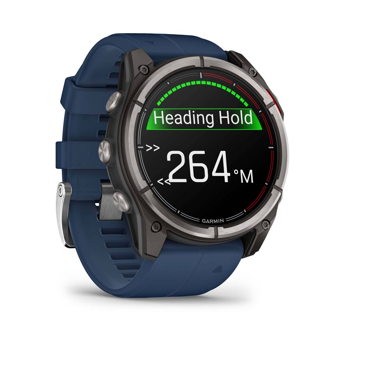 Meet quatix® 8 — the ultimate nautical smartwatch built for captains and those who feel at home on the water. It features a bright 1.4” AMOLED display with a scratch-resistant sapphire lens, durable titanium bezel and powerful LED flashlight. Use the built-in speaker and mic to control your compatible chartplotter via BLUETOOTH® connectivity or for on-wrist calling when paired to your smartphone. Seamlessly control your Force® trolling motors, Fusion® stereos, autopilots and compatible Garmin chartplotters from your wrist while keeping an eye on data streamed from your onboard system. Go below the surface with a 40-meter dive rating, leakproof buttons and support for scuba and apnea diving plus activity tracking for 100+ indoor and outdoor sports. Get more out of your time on the water with the preloaded boating and sailing apps. Prepare your body for the helm and beyond with performance insights that help you manage your exertion and build stamina while training readiness features show how much recovery time you need between workouts. Enjoy extended adventures at sea with up to 16 days of battery life in smartwatch mode.