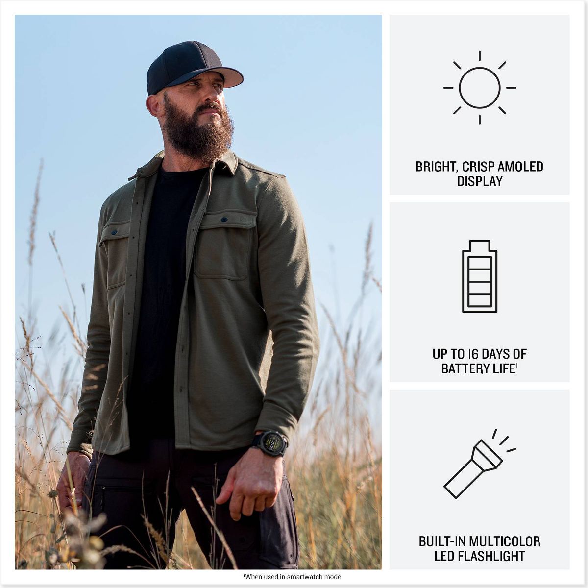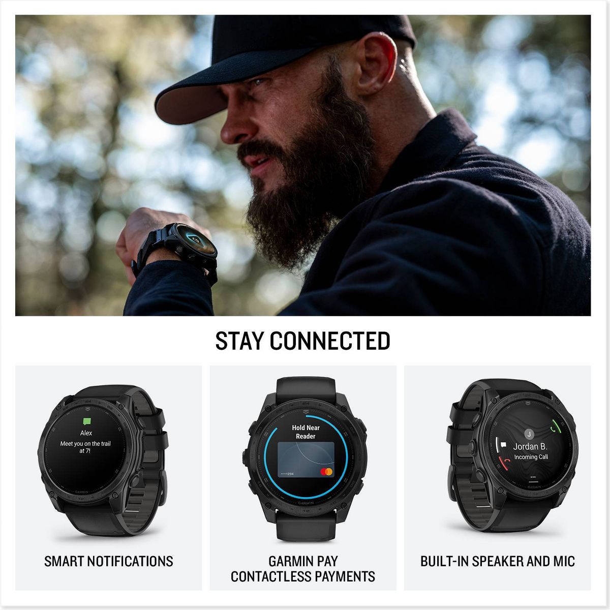 Rise above with tactix® 8. It’s the ultimate tactical smartwatch, featuring a stunning AMOLED display, titanium bezel, sapphire lens and a 40-meter dive rating. Pair with your smartphone for on-wrist calling with the built-in speaker and mic. Dedicated tactical features include a rucking activity and preloaded Applied Ballistics® solver along with a jumpmaster activity, waypoint projection, stealth mode, kill switch and more. Guide the mission with a built-in LED flashlight. Train like never before with strength training plans, sport-specific workouts and daily suggested strength workouts for runners and cyclists. Navigate the outdoors with superior positioning accuracy, thanks to multi-band GPS with SatIQ™ technology plus built-in sensors for the 3-axis compass, gyroscope and barometric altimeter. Push harder with up to 29 days of battery life in smartwatch mode.