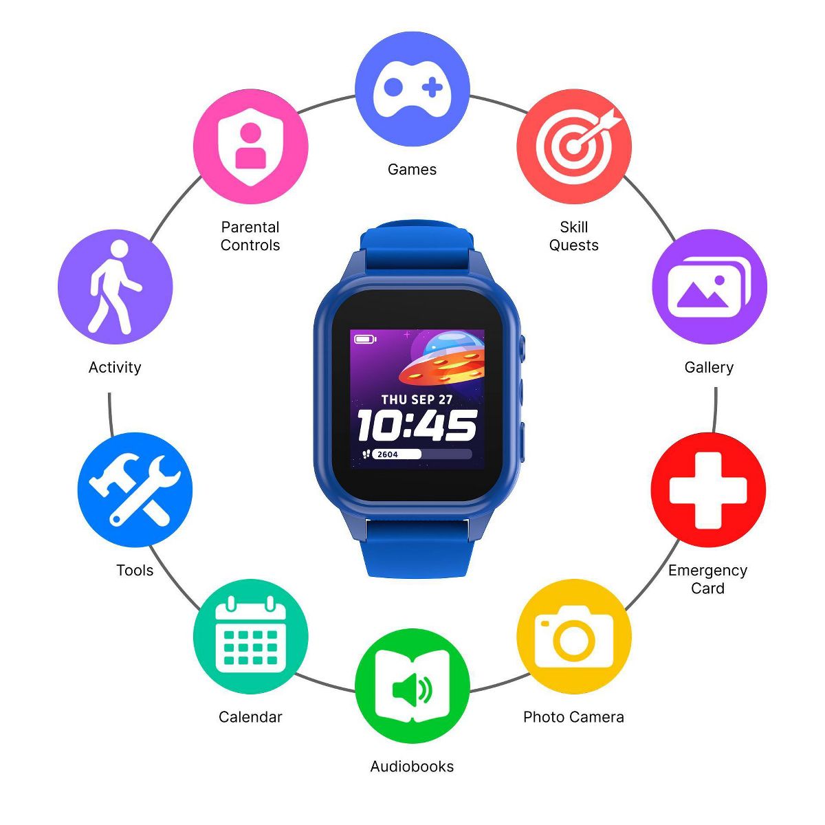 PLAYZOOM 4 is the ultimate smartwatch for kids ages 4–12, packed with educational fun, safety features, and creative tools—all in a durable, splash-proof design. With a large 1.83" color touchscreen, this smartwatch includes over 25 built-in games, audiobooks, and sing-along songs to keep kids entertained and engaged. A front-facing selfie camera, voice recorder, and custom watch faces encourage self-expression, while a step tracker helps promote active habits.