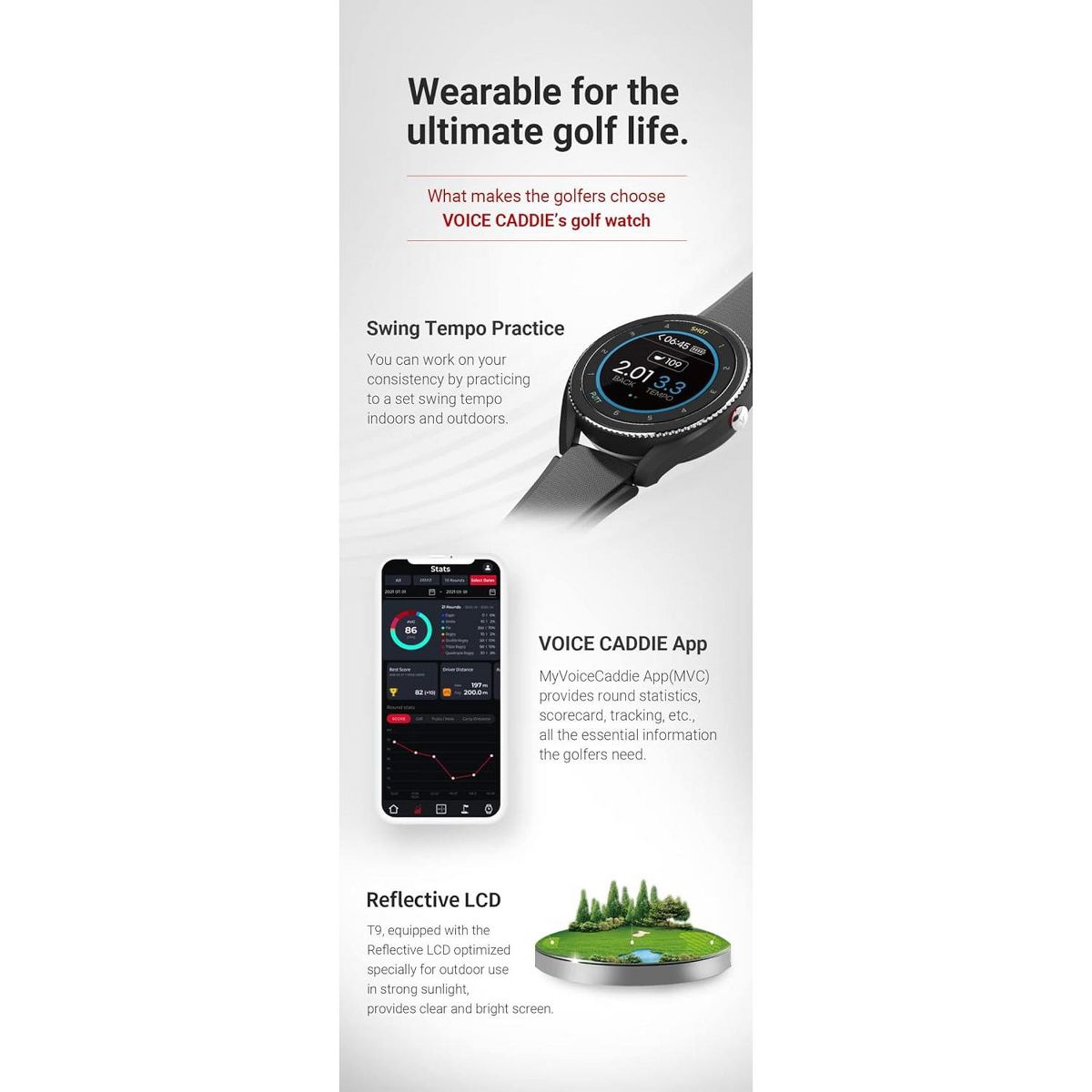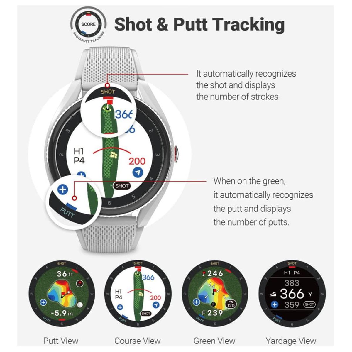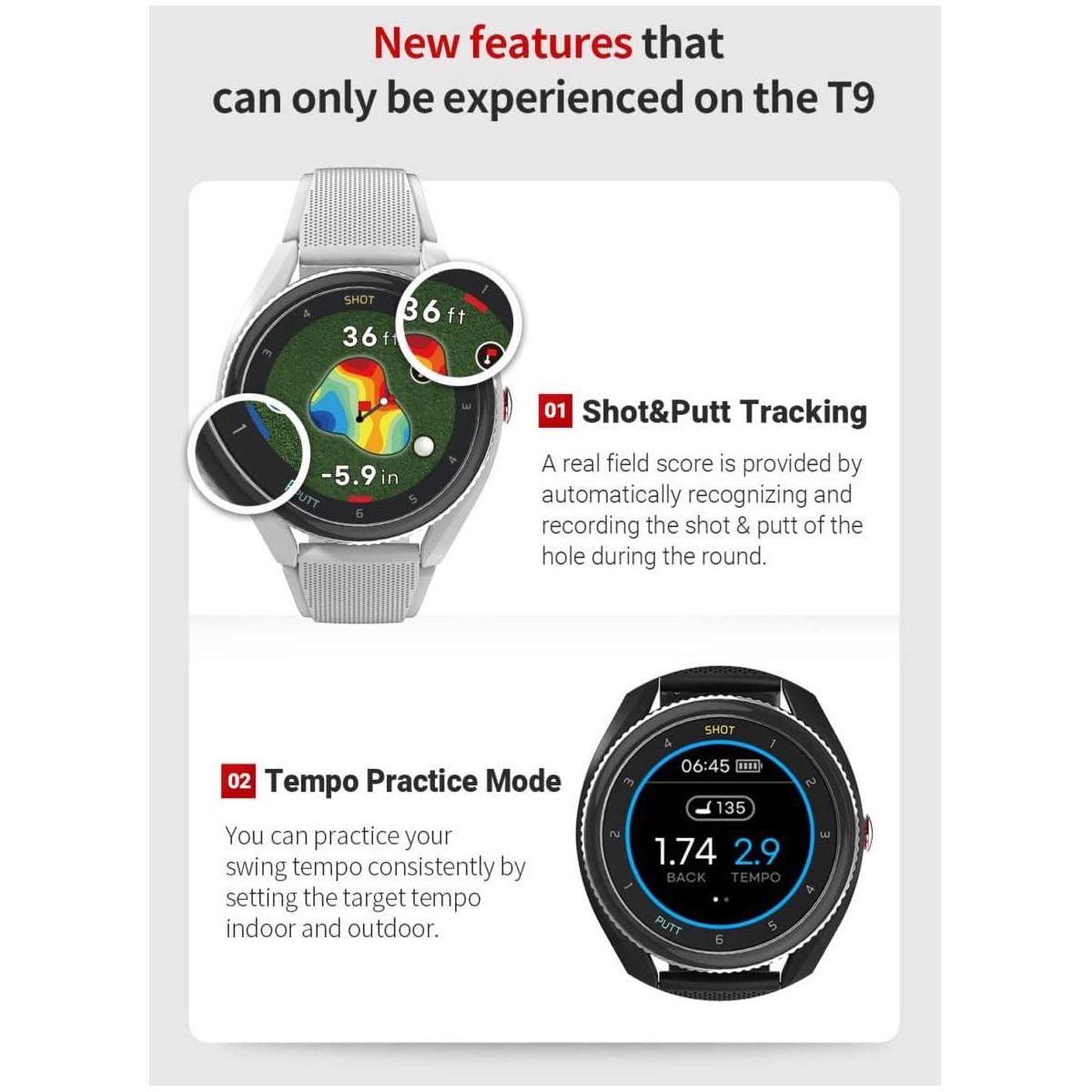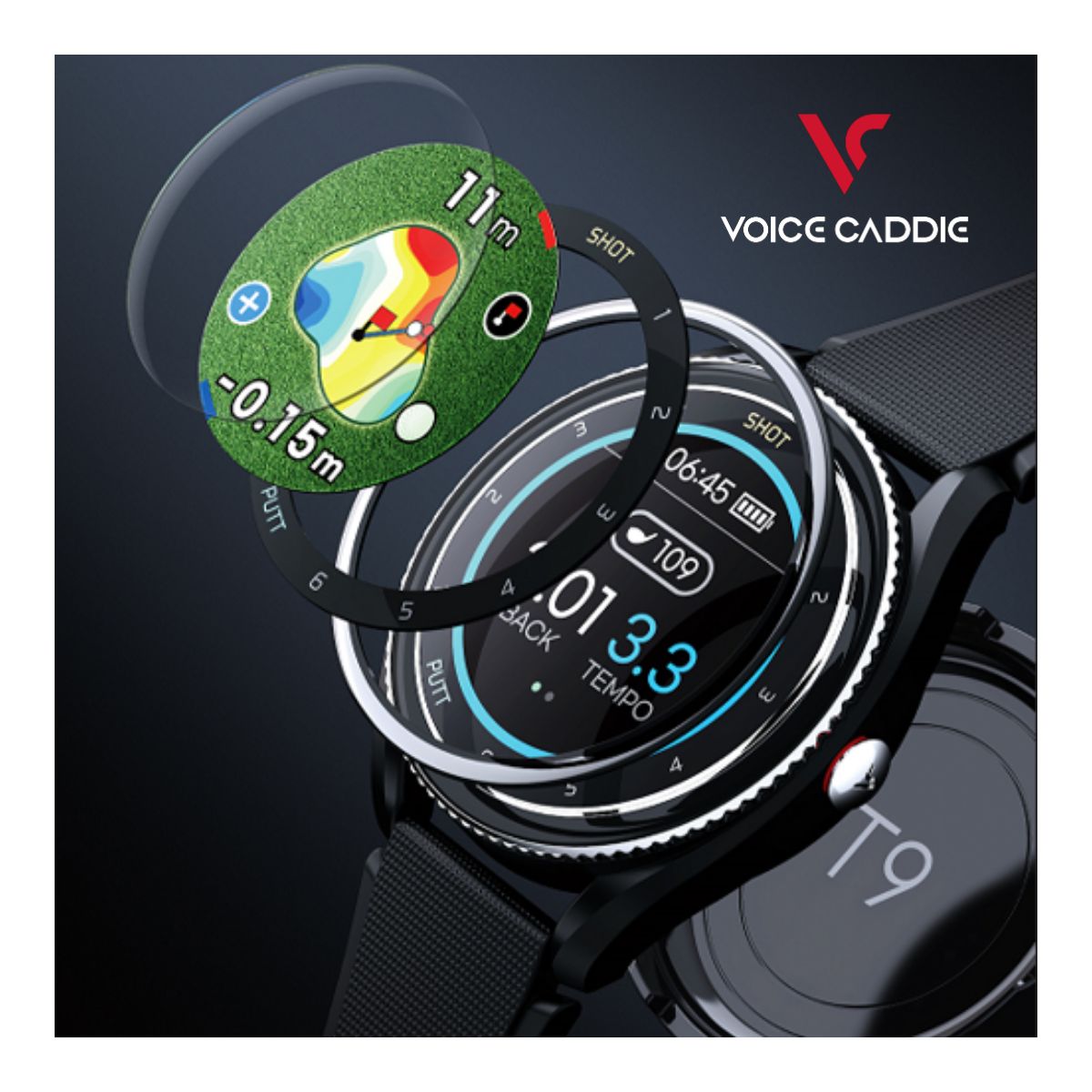 The T9 is the newest addition to the Voice Caddie T-series line! The T9 comes equipped with shot and putt tracking which keeps track of your score throughout the round so you don't have to. Full color touchscreen, provides yardages to the front/center/back of the green, and offers advanced features such as Active Green (improves accuracy), V-Algorithm 3.0 (slope calculation), green undulation (indicated with heat map and arrows show break direction), putt view (shows elevation and distance to pin) smart green (touch pin-placement), course views (yardages to hazards and bunkers). Practice anytime and anywhere with practice tempo mode to dial in your swing to perfection.